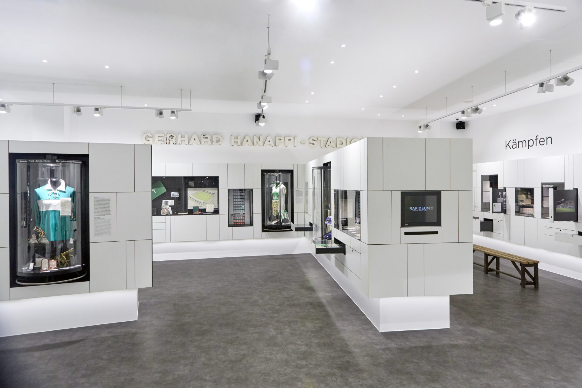 „Rapid ist Geschichte, werde ein Teil von ihr!“, steht an der Wand der Spielerkabine des SK Rapid geschrieben. Nur einige Schritte neben der Kabine liegt das Rapideum, in dem diese Geschichte lebendig wird. Auf 165 m² warten die unterschiedlichsten Erinnerungsstücke darauf, entdeckt zu werden. Der präsentierte Bogen spannt sich von der Gründung des 1. Wiener Arbeiter Fußball-Clubs im Jahre 1897 bis in die Gegenwart. Neben 31 klassischen Vitrinen, vier Video-Stationen und zwei originalgetreuen Stadionmodellen laden 59 versteckte Laden und Kästen dazu ein, in die Klubgeschichte einzutauchen. Dabei gibt das Motto Gemeinsam. Kämpfen. Siegen. die thematische Ausrichtung vor.